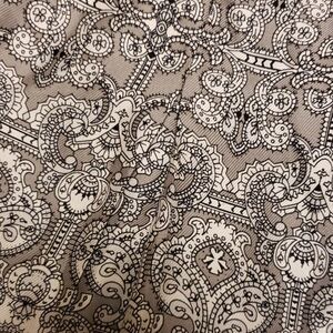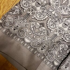 Silvery gray and white baroque patterned fully lined 100% silk drop pleat skirt. Side zip. EUC. 13 inches across waist. 19 inches waist to hem.