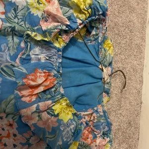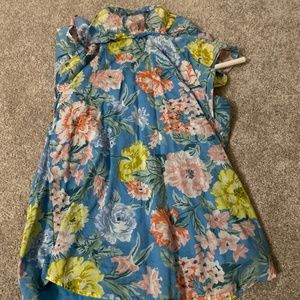 This is a really cute shirt. It’s a lovely floral print tank top with a very feminine ruffled neckline. It’s cotton and fully lined. It’s cute tucked into a skirt or worn not tucked in over pants. It’s wrinkly from storage, but no known flaws.