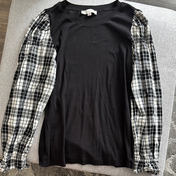 Classy and chic Loft blouse with gingham sleeves! This blouse is so comfy and pretty. Pre-loved but excellent condition no marks or wear and tear!