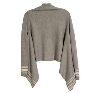 Loft grey cardigan size small that would be perfect for layering. It features a unique asymmetrical design and stylish striped detailing on the edges. The cardigan is open-front with no buttons or zippers, and the front panels are longer and drape down. The sleeves are long and provide full arm coverage. The fabric is soft and comfortable, suitable for various seasons.