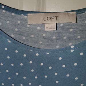 Slate blue blouse with white polka dots. Fits a bit loose, hem is high-low. Super comfortable, yet could go from day to night. Size M