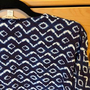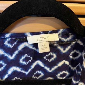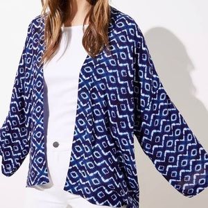 From Ann Taylor LOFT. Navy and white. Slightly sheer. Kimono inspired. Short length. Sleeves may fall at wrist depending on your arm length. Unlined and lightweight. No closure. Very good preloved condition.