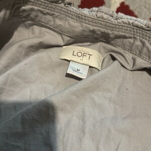 Grey Loft jacket. Hook and eye closures. Ruffle detail around edges.