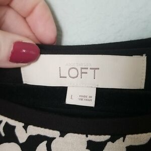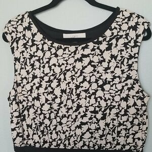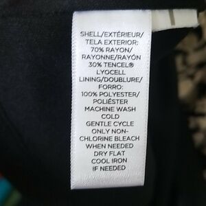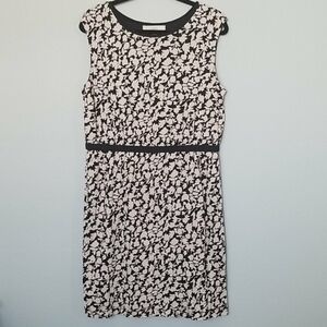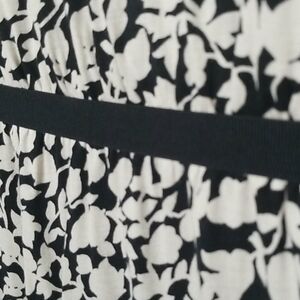 Leaf/ floral silhouette pattern dress. Has a ribbon style belt that goes all the way around. Dress is lined. Has slight stretch to fabric. A very comfy dress in excellent condition. Smoke free home. Cream color on black background. Office, nature, workplace, neutral, career, professional, brunch, dinner, date night, feminine, comfort