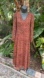 This dress starts with a sheer, rusty, orange and black leopard print fabric. Fitted close to the body to under the bust. The skirt descends in three widening, ruffled tears to the hem. Fully lined except for the sleeves and an excellent condition. New with tags.