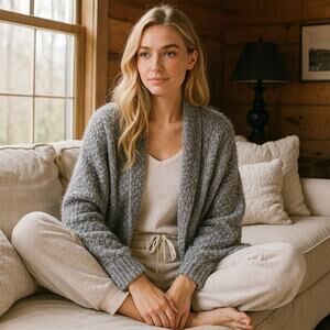 Cozy up in this soft gray open-front cardigan featuring a textured knit design and relaxed fit. Perfect for layering over loungewear or casual outfits, this piece brings a touch of farmhouse charm with its cozy, homey aesthetic. Ideal for cool mornings, relaxed evenings, or curling up with a book in your favorite chair.