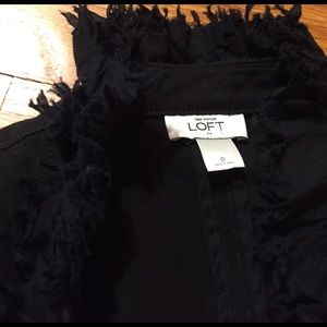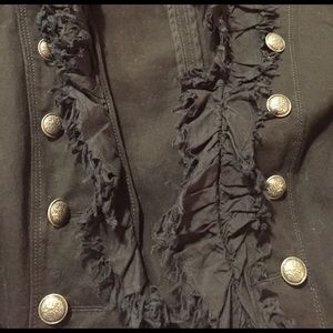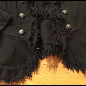 17.5” bust armpit to armpit (hooked without stretching)Length 23.5” VGUC Gorgeous romantic & Feminine black cotton/spandex. Denim Fitted Jean jacket w/aged chrome buttons and fabulous free form lapel & hem . Tie back for decoration and perfect fit boho style