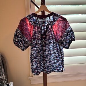 Loft patchwork top wtih flower prints, v neck with tie, puffy sleeves