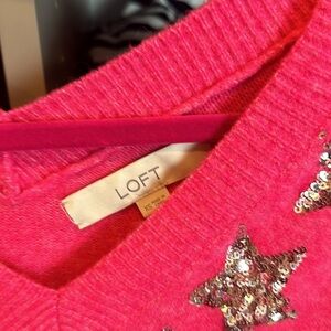 Loft pink with silver sequin stars long sleeve v neck sweater size XS