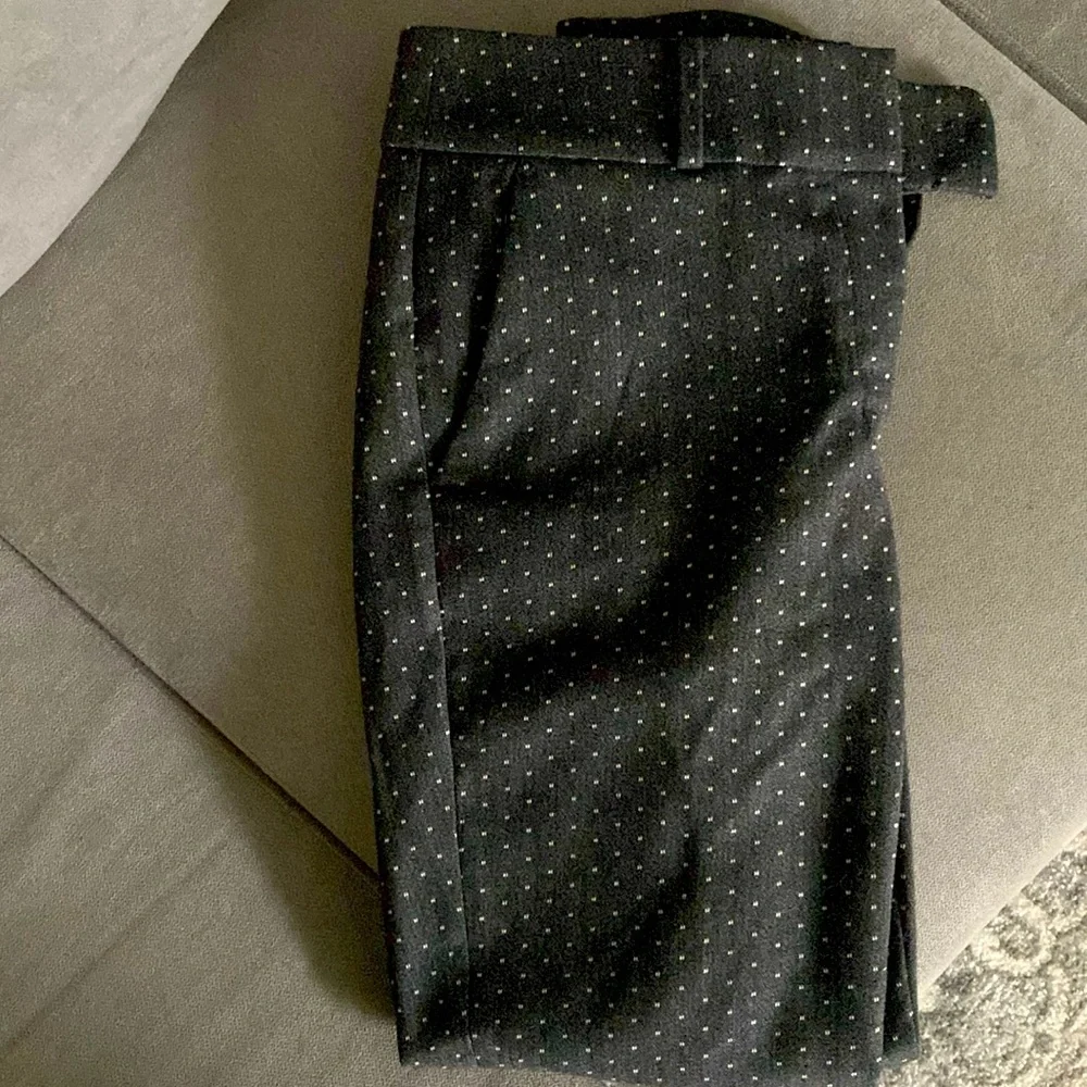 Never worn - charcoal gray Marisa Skinny dress pants; small white embroidered polka dots