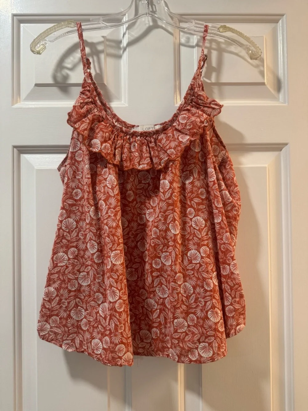 Sleeveless rust cami with white floral pattern. Features ruffle neckline and thin adjustable straps. Lightweight, breezy fabric ideal for warm days. Feminine silhouette that layers easily.