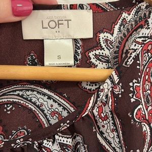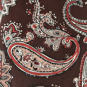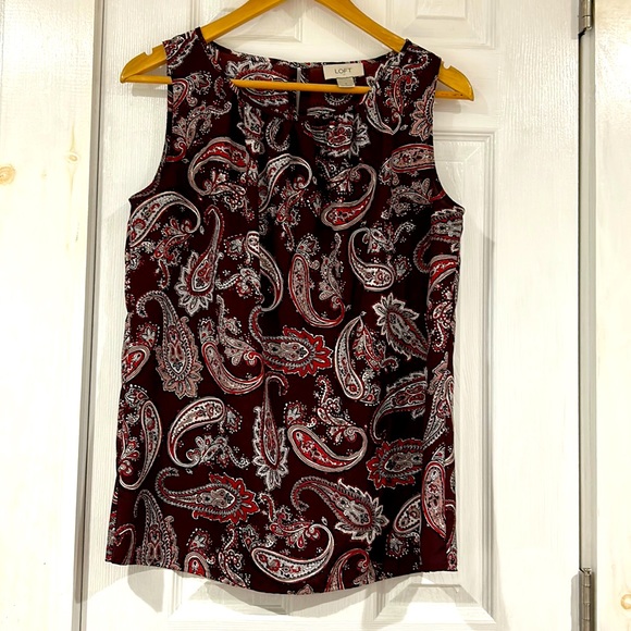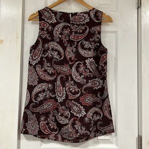 Burgundy, black, while, and mauve paisley sleeveless shirt. Great for under a blazer. The material is thin and smooth for easy tuck in. 100% polyester. Smoke free, cat friendly home