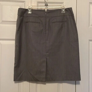 Loft size 12 gray skirt. Knee length at 22.25 inches. Subtle vertical pinstripe. Button detail at naval. Rear zipper. Center split in back 7 inches. Rear pockets. Lined.