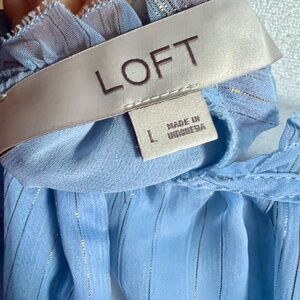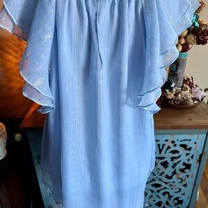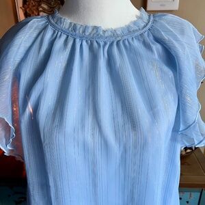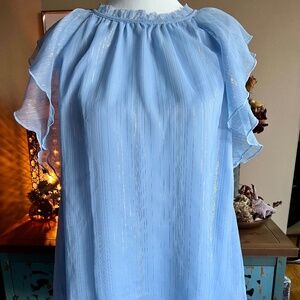 Beautiful pale blue loft flutter sleeve blouse with metallic thread running through out, feminine neckline, flattering fit, worn once, in like new condition!