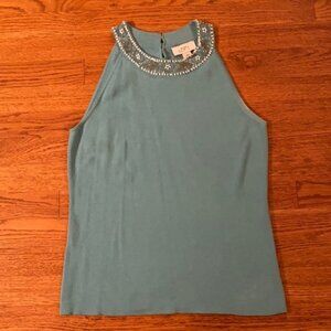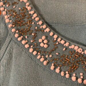 Beautiful blue teal knit top, with delicate beading at the neckline. Double button closure at the back of the neck.