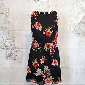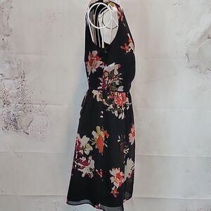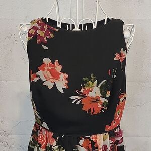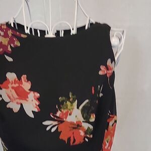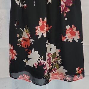 Vibrant floral print on black sleeveless mini by Loft with a gathered waistline, zipper back closure, and straight hemline. Great pre-owned condition and ready for spring.