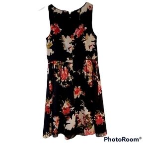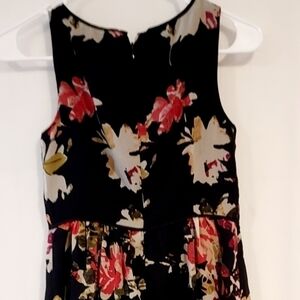 Nice rounded neck; sleeveless; zip up back; fully lined; waist. Fabric a pretty flower detail & is sheer on top and fully lined.