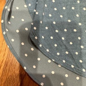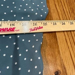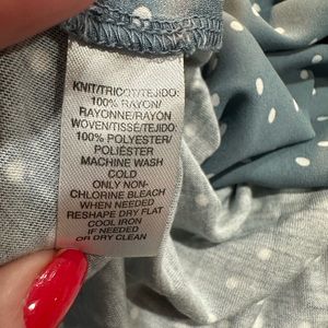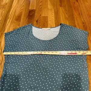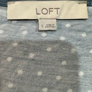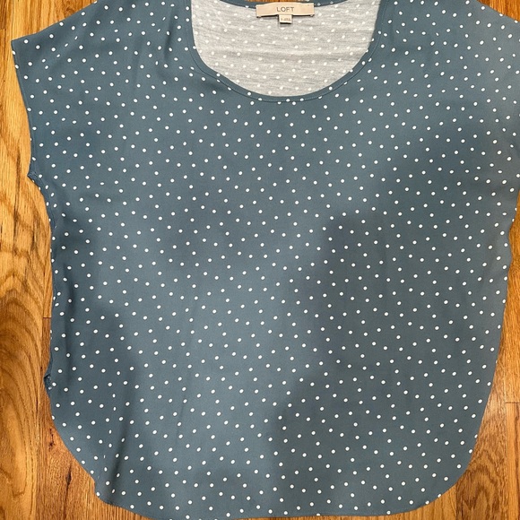 Loft. Small. Slightly longer in front. Front is more blouse like material. Back is more Jersey t-shirt material. Lightweight. Soft. Great year round top.