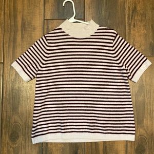Short sleeve, mock neck. Maroon and cream stripes.