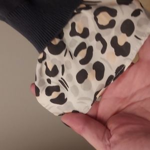 Super cute grayish blue sweater with animal print bell sleeves in white, black and blush pink.