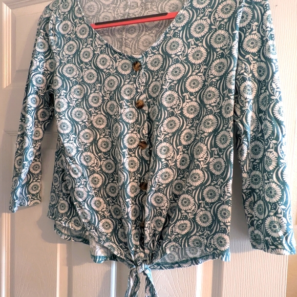 comfy crop top with tie in the front. has workable buttons. looks cute with a cami under for those who want to cover any skin. Nice loose fitting. very comfortable.
