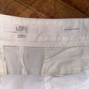 Loft The Riviera, flat front, side button, preppy, white, preppy, chino shorts. Pairs well with a button down shirt or basic tee. Approximately 16 inches across the waist, 10 inch rise, and 3.5 inch inseam. Brand new. From a pet and smoke free home.