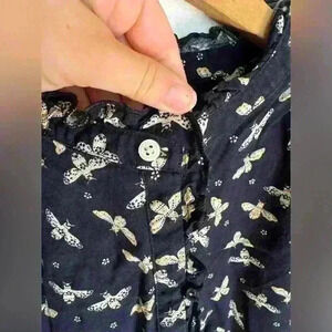 Loft women’s button up blouse with a bee or moth print. Dark navy blue cotton blend (54% cotton and 46% rayon) in a size XS. Total length in the front is 21” and the back is 23” and pit to pit is 16”. Preowned but no visible wear.