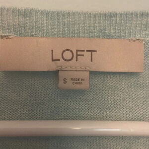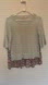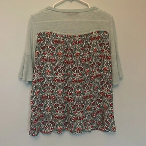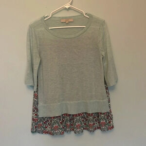 Heathered pale blue knit front with Bell sleeves, hitting at elbow. Back and hem fabric is a floral print polyester. Tulip Garden mixed media lightweight sweater.
