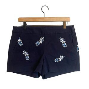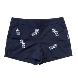 Loft Beaded Pineapple Novelty Shorts. Features a high quality ribbed-textured navy blue short with embroidered & beaded pineapples throughout. Side pockets. Hidden side zipper closure. Cotton/Rayon/Spandex blend. Measurements in pictures.