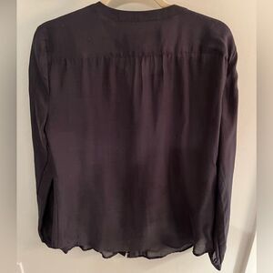Muted purple, Loft button down, lightweight sheer fabric, pleated design with fabric panel and lace trim detail that covers buttons