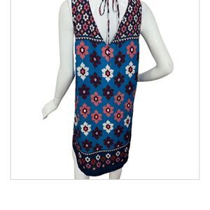 Really adorable shift dress. Yoke and bottom have a smaller floral print while the middle has a beautiful bigger print. Ties in the back at the neck leaving a deep "V" to show off that perfect summer tan! Side zip for easy on/off. This dress can be worn literally EVERYWHERE.