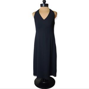Loft Ann Taylor Halter Black Midi Dress, perfect for any special event, so elegant! Flattering Halter style front but crosses in back, side zipper, fully lined, crepe material, flattering flare bottom