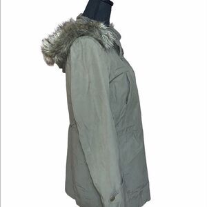 Loft Petite Water Resistant Hooded Parka Jacket. Olive green water resistant parka with faux fur hooded collar. Removable hood with hidden zip. Long sleeve with snap button cuff. Full zip closure with snap buttons at chin. Chest pockets with zip closure. Waist pockets with flap. Inner adjustable toggle waist. Fully lined. Shell: 62% cotton/38% fiber. Body lining: 96% cotton/4% spandex. Size: MP. Preowned in good condition.