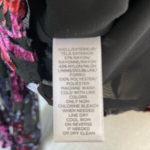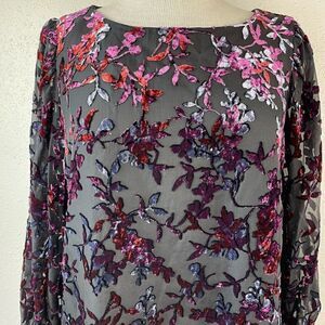 Beautiful botanical velour style design on this blouse top measuring 22 inches armpit to armpit laying flat and 24 inches in length from shoulder to hem.