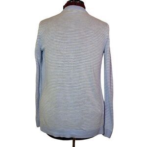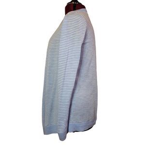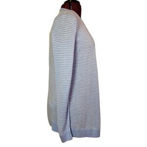 Light blue and white colors, horizontal striped pattern, open front closure, long sleeves, cuffed, relaxed fit, lightweight and very comfortable. Great condition!