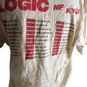 Logic Bobby Tarantino Vs Everybody 2018 Tour Graphic Tee, Size Medium. Official Logic concert tee from the Bobby Tarantino vs Everybody Tour featuring NF and Kyle. Front graphic shows a detailed illustration with bold red "V" design and tour title. Back lists all 2018 tour stops across the U.S. and Canada. Please note measurements, size tag is not available. Good condition.