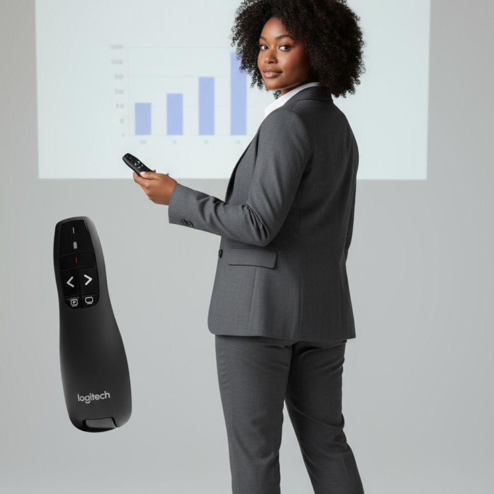 Logitech wireless presenter remote. Black color. Easy to use. Ideal for presentations.