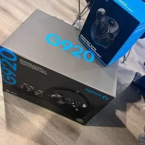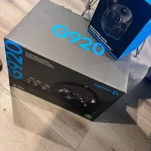 Experience precision with the Logitech G920 racing wheel. Features a sleek black design with vibrant blue highlights.
