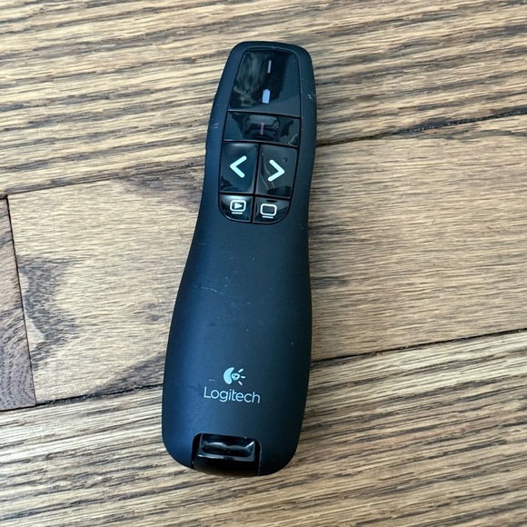 Sleek black Logitech presenter with intuitive navigation buttons.