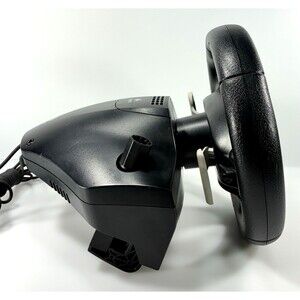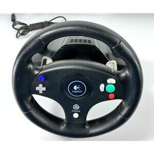 Logitech Speed Force racing wheel designed for the Nintendo GameCube, model E-X4A10. It has been tested and is fully functional, offering responsive controls and an authentic racing experience. The wheel connects directly to the GameCube with its wired setup and is compatible with popular racing titles, providing smooth steering and reliable feedback. The unit shows normal signs of use but remains in good working condition, making it a great choice for collectors or anyone looking to enhance their GameCube racing games.