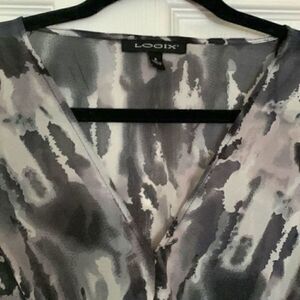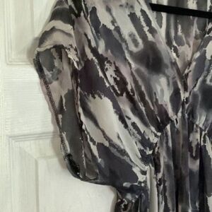 Logix gray & black printed sleeveless empire waist beach coverup, size small. There is a thread Pull close to the front. No holes of anything and not very noticeable but picture of it up close is included. Preowned condition.