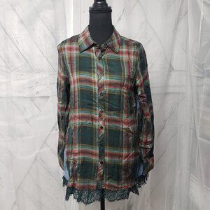 Logo Green Plaid Lace Chambray Modal Button Down Tunic Blouse Size 6