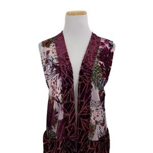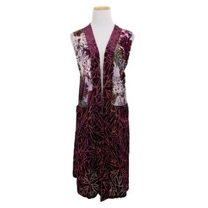Logo Lavish Longline Velvet Burnout Duster Vest. Women’s XS, a bit oversized, can fit a medium. Lightweight. Semi sheer. Open front. Good preowned condition. Free of rips, holes or stains.