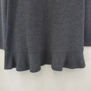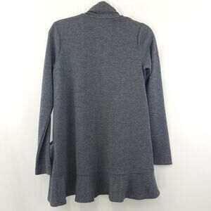 Logo Lori Goldstein gray open front cardigan. Front pockets. Textured material, almost a small waffle knit pattern. Ruffles out slightly along the bottom. A little shorter at the front, draped style. Missing size tag, size is approximate based in measurements. Measurements are taken when laid flat and are approximate: Armpit to armpit 18.5 inches, length from shoulder 28 inches