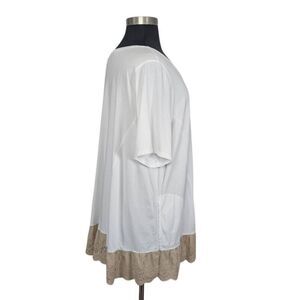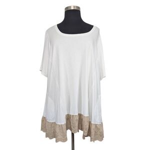 This easy white jersey mini dress/tunic top features squared off scoop neck, half sleeves, two side pockets and tan eyelet trim. Would look cute with bike shorts or leggings or over a long flowy skirt, maybe with a vest or light jacket. Great layering piece!