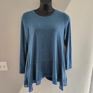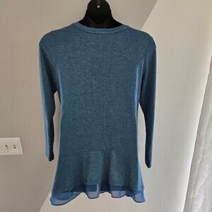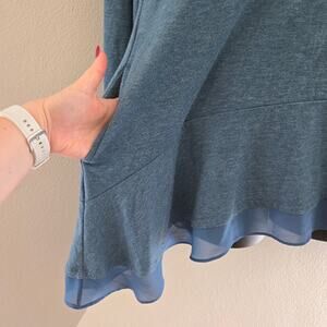 Heathered teal long sleeve top with sheer ruffle hem and pockets. Great used condition! Super comfy and flattering in different weather and styles.