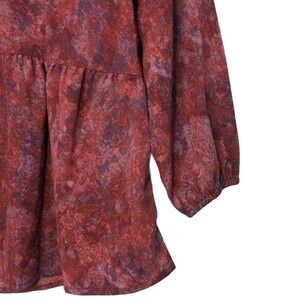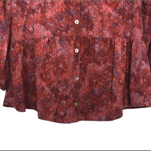 LOGO by Lori Goldstein Stretch Woven Button Front Blouse. In the color Crimson, a maroon-red shade. Pointed collar; button-front closure; long sleeves with elastic cuffs. Shirring detail throughout.