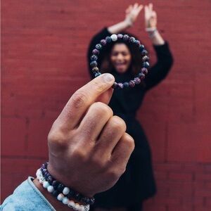 White bead is infused with water from Mt Everest, black bead carries mud from the Dead Sea