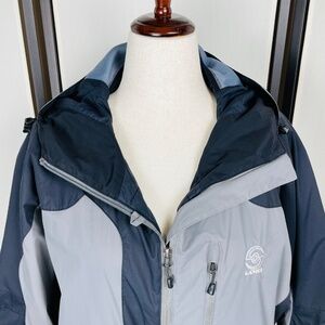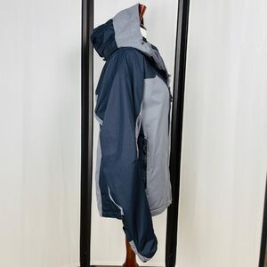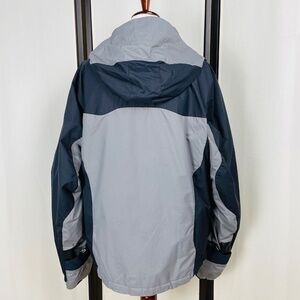 Loki Snowboarding or Skiing Jacket in Gray and Black, Convertible Mitt ProCuff can be flipped to be an incorporated mitten, Face Shield can be used or tucked behind with Hood, Zip Pockets inside and out, Powder Guard can be snapped to your own ski pants or belt to prevent snow from getting inside your clothes, Underarm Zipper for ventilation, Drawstring Bungee at Hem and in HoodSize M, Pit to Pit = 24", Shoulder to Hem = 27.5" front, 29" back, Sleeve 27". Winter, Outdoor, Snow, Ski, Snowboard, Mountain, Mittens, Gloves, Warm, Active. Palm of right mitten has some of the waterproof material missing, left hand is perfect - see photos.