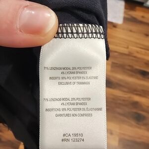navy elbow length sleeve with satin v neck trim. black satin bottom layer that peeks out